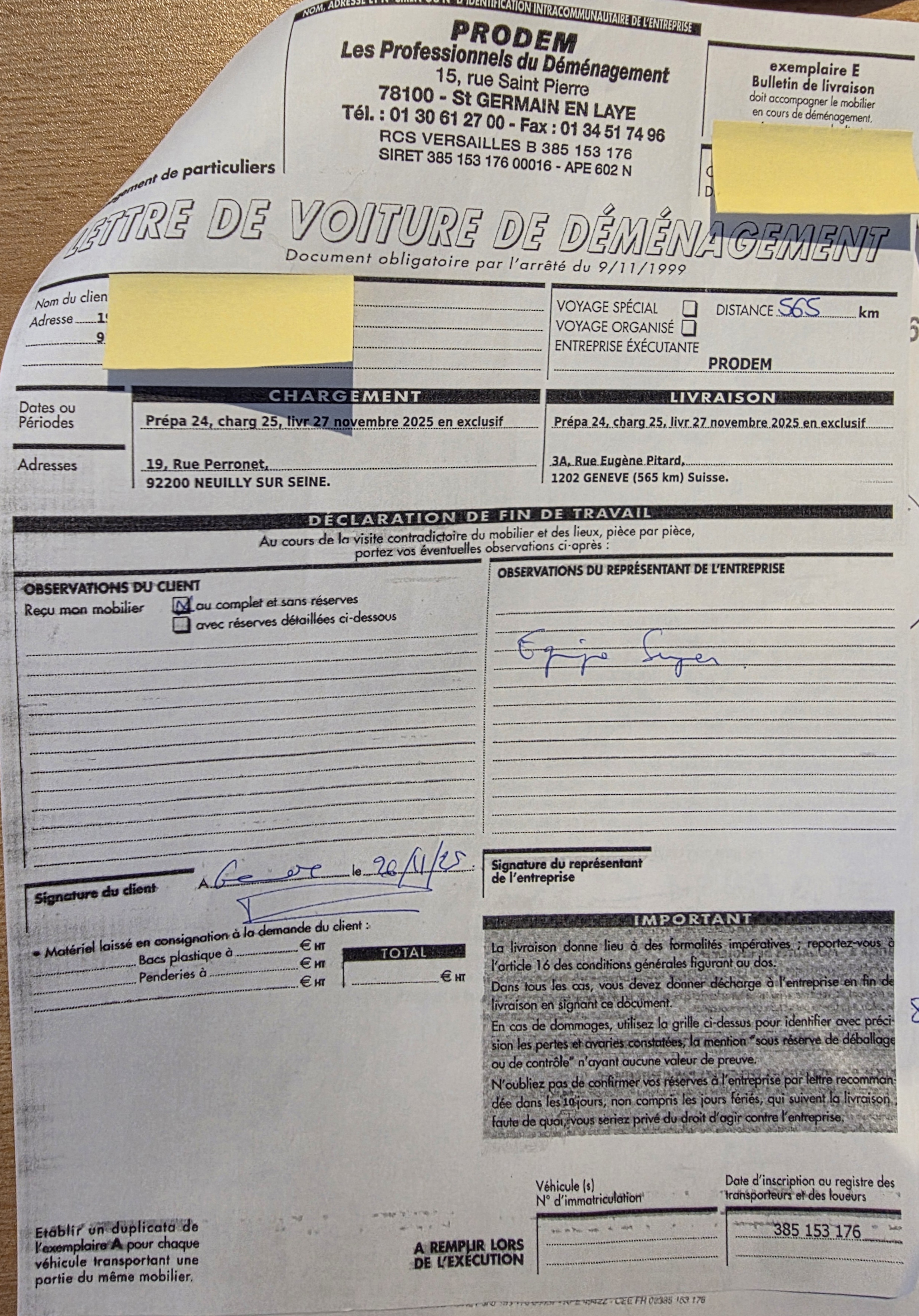 Déménagement Novembre 2025, de Neuilly sur Seine (92) à Genéve (Suisse)